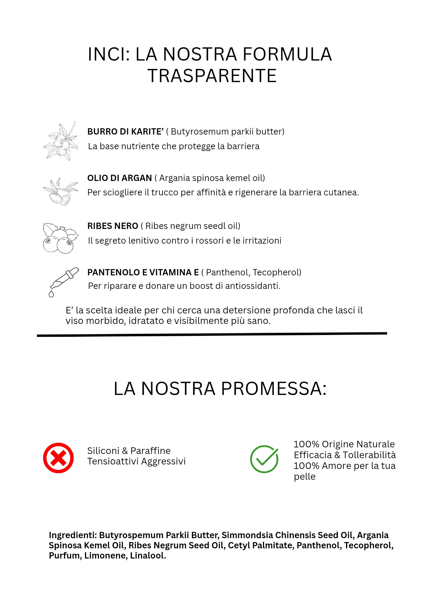 Trasforma il momento dello strucco in un rituale di puro benessere. Il nostro Burro Struccante all'Argan non è un semplice detergente, ma un trattamento nutriente che rispetta l'equilibrio della tua pelle. La sua texture solida e vellutata si fonde istantaneamente al contatto con il calore delle dita, trasformandosi in un olio prezioso capace di sciogliere anche il trucco waterproof più ostinato, i filtri solari e l'inquinamento urbano.